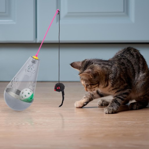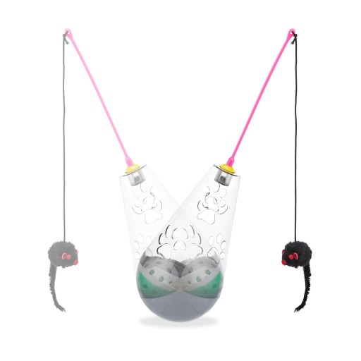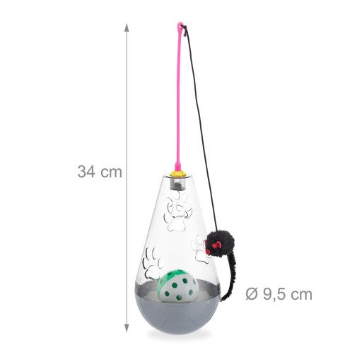 Koty są uważane za bardzo wymagające zwierzęta i nie każda zabawka budzi w nich naturalny instynkt łowiecki. Nasza zabawka dla kota 3 w 1 oferuje Twojemu kilka zachęt do zabawy, skakania i grasowania. Kubek dla kota zawiera piłkę z dzwonkiem i różdżkę z myszką. Dodatkowo stożek kołyszący może być napełniany smakołykami i służyć jako dozownik przekąsek. Atakując kubek lub różdżkę, jedzenie wpada przez otwory, a Twój kot zostaje nagrodzony małym smakołykiem. Zabawki są również świetną zabawą, gdy są używane osobno.