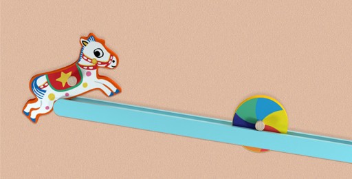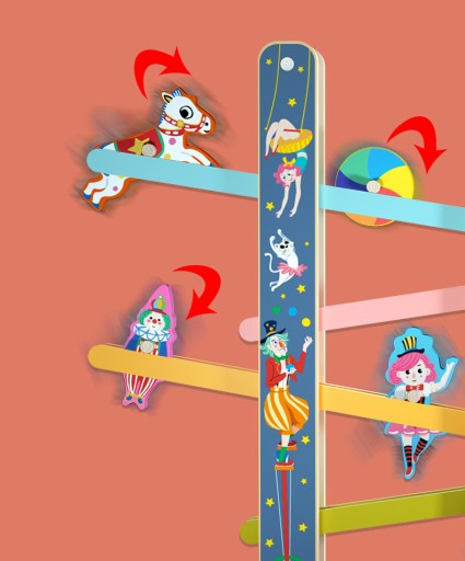 Kolorowa drewniana zjeżdżalnia z postaciami z cyrku, które w niespotykany sposób zjeżdżają w dół. Dzięki zabawie, dziecko uczy się praw fizyki doskonale się przy tym bawiąc.