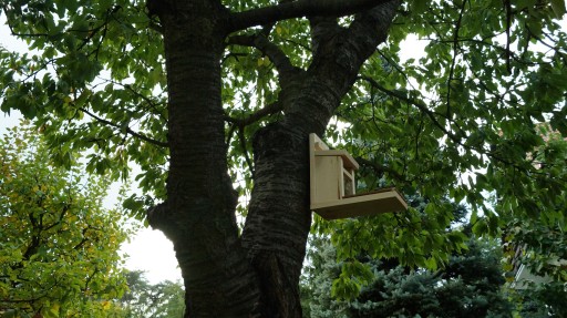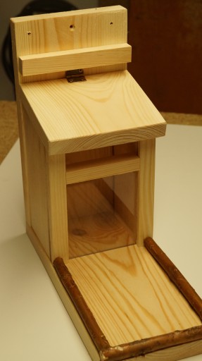 - gałązki na tarasie blokują spadanie wyciąganego pokarmu na ziemie a niewielkie szczeliny pod nimi usuwają deszczowa wodę ( szczelna obudowa tarasu powoduje tworzenie się tafli wody która niszczy karmnik oraz może się przedostawać do pożywienia )