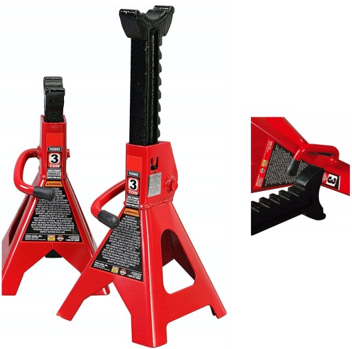 Komplet podstawek samochodowych 3T łącznie 6T. Bardzo solidnie wykonane stojaki z grubej stalowej blachy z mechanizmem zapadkowym umożliwiającym bardzo precyzyjne ustawienie wysokości na wielu poziomach , mocny mechanizm zapadkowy gwarantuje bezpieczeństwo
