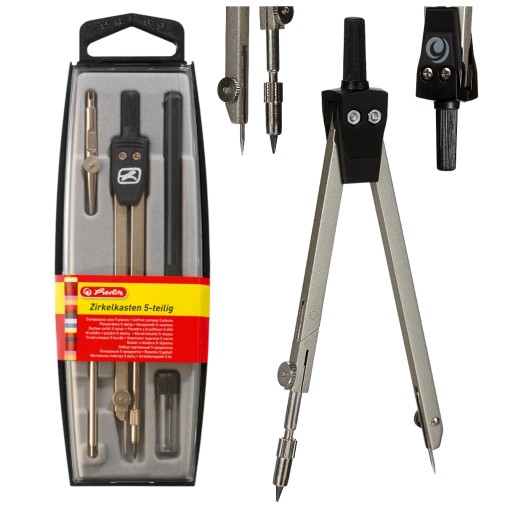 👉 Klasyczny szkolny cyrkiel w zestawie z dodatkowymi rysikami.