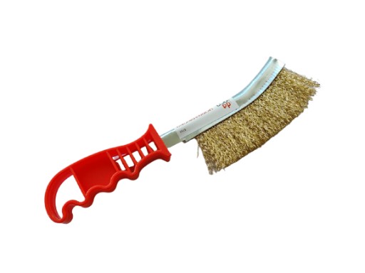 Szczotka wykonana z karbowanego mosiężnego drutu oprawionego w metalowy uchwyt z plastikową rękojeścią.
