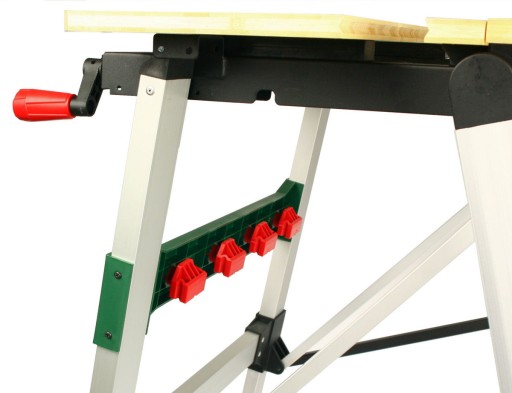 Stół PWB 600 firmy BOSCH został wyposażony w dwa uchwyty śrubowe oraz szczęki które umożliwiają mocowanie elementów o różnych kształtach i rozmiarach zarówno w pionie jak i w poziomie.