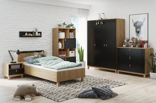 Komoda z 3 szufladami (MOD-5) z kolekcji MODERN to nowocześnie zaprojektowany produkt w stylu Soft- Loft. Połączenie czerni, dębu kamiennego i delikatnych frezów nadaje indywidualnego charakteru. Idealnie dopasuje się do wnętrz dziecięcych, młodzieżowych a nawet pokojowych. Prosta konstrukcja, nowoczesny design oraz minimalistyczne zdobienia będą współgrały z każdym wystrojem.