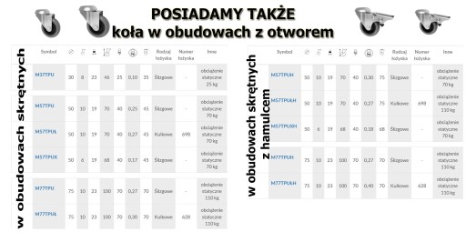 - Koła tworzywowo - poliuretanowe są odporne na wstrząsy, uderzenia oraz korozję