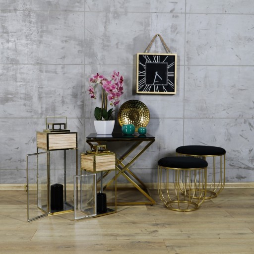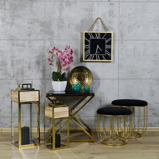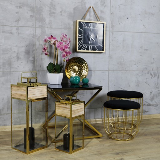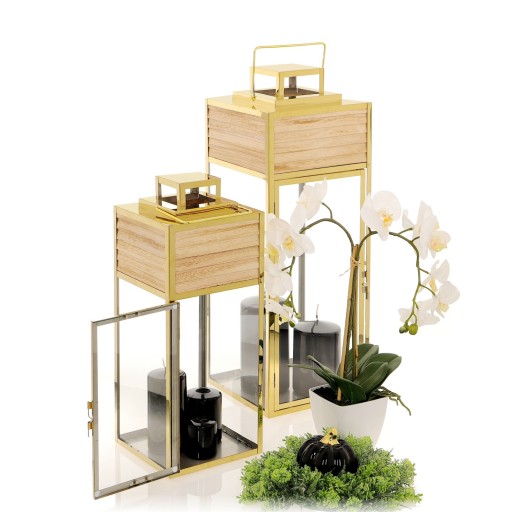Przedstawiamy Państwu elegancki, metalowy komplet dużych latarni w kolorze złotym wykonany ze stali nierdzewnej. Komplet składa się z 2 lampionów: dużego oraz średniego. Latarnie posiadają otwierane frontowe drzwiczki a w ich środku można umieścić świece naturalne lub ledowe dostępne na naszych pozostałych aukcjach, lub inne dekoracje czy kompozycje. Górna część lampionów zdobiona jest stylowym drewnem. Latarnie posiadają też uchwyty ułatwiające przenoszenie lub zawieszenie. Boki wszystkich lampionów są przeszklone.