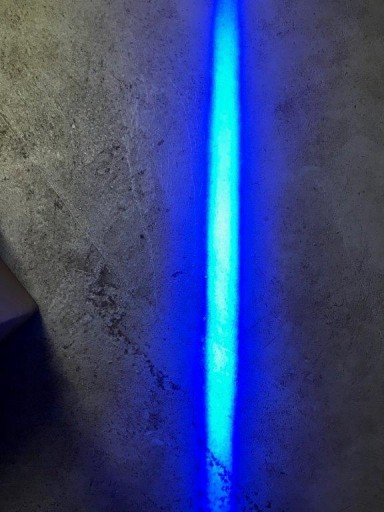 Lampa świeci w linią kolorze niebieskim , wyznacza teren pracy wózka widłowego lub innej maszyny.a