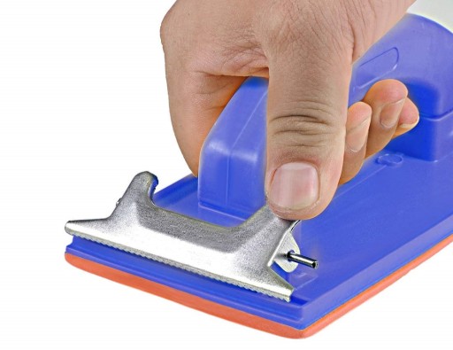 Materiał ścierny mocowany jest na motylki, dodatkowo płaszczyzna, do której przylega papier pokryta mikrogumą poprawiającą przyleganie papieru. Takie wykonanie sprawia, że materiał ścierny pozostanie na swoim miejscu, nawet w przypadku silnego tarcia.