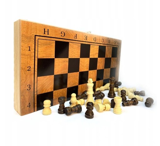 Figury szachowe wykonane z tworzywa sztucznego, żetony zostały wykonane z drewna, gładko i prosto wykończone.