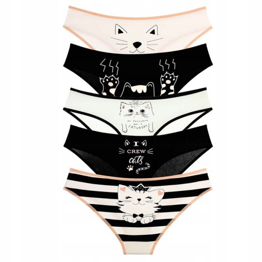 Śliczny zestaw 5 sztuk majtek w kotki. W zestawie majtki w kolorze białym i czarnym wykończone różowymi detalami. Na niektórych modelach wzór znajduje się z tyłu. Oferowane produkty przez LILLY BLING są świetnej jakości. Bielizna wykonana z wysoko gatunkowej bawełny, gumki podczas użytkowania nie wyciągają się.