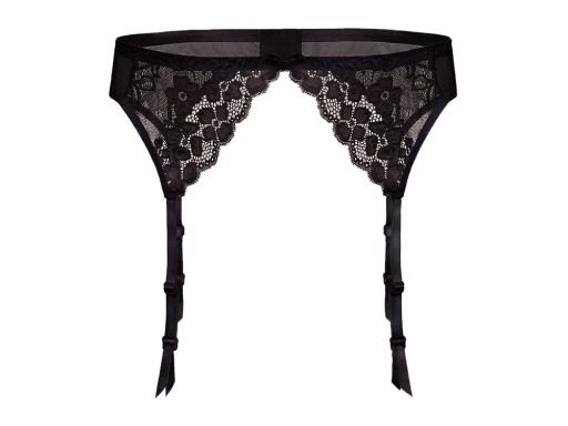 Koronkowy pas do pończoch z dużym kwiatowym motywem, w którym dwa trójkąty łączy u góry kokardka, a paski do pończoch i zapięcie są regulowane. Niezastąpiony dodatek bieliźniany w kobiecej szafie. Pas dostępny jest w wersji czarnej, białej oraz czerwonej.