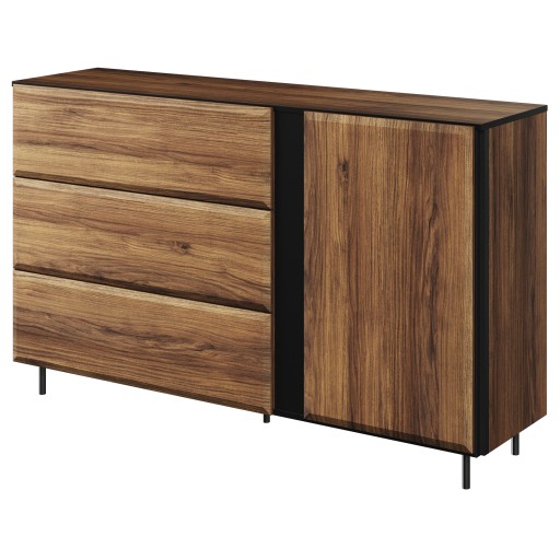 Duża i pojemna komoda w stylu nowoczesnej elegancji. Oryginalny styl mebla to zasługa charakterystycznych, dzielonych frontów z ciekawie frezowanymi krawędziami. O wygodne otwieranie szuflad zadbał system push to open i/lub soft close. Mebel wspiera się na lekkich, bardzo smukłych nóżkach. Połączenie czerni z dekorem w kolorze ciemnego drewna prezentuje się modnie, stylowo, a jednocześnie wprowadza do wnętrza dużo przytulnego ciepła. Komoda oferuje dużo miejsca do przechowywania. W trzech pojemnych szufladach wygodnie przechowasz bieliznę, dokumenty czy inne akcesoria. Za drzwiami szafki znajdziesz pojemne półki. Mebel wykonano z wytrzymałej płyty laminowanej z obrzeżami wzmocnionymi ABS oraz trwałej płyty MDF.