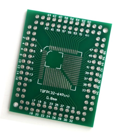 Uniwersalna dwustronna przejściówka umożliwiająca montaż układów TQFP SMD na płytkach uniwersalnych przystosowanych do montażu elementów THT. Możliwe jest zastosowanie układów TQFP od 32 do 64 pinów z rastrem 0,8mm oraz od 32 do 100 pinów z rastrem 0,5mm.