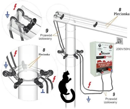 Elektryzator oraz osprzęt można łatwo i sprawnie zamontować na rynnach i rurach odprowadzających wodę opadową, dzięki czemu urządzenie zabezpiecza budynek przed wspinaniem się kun na dach w celu założenia gniazda.
