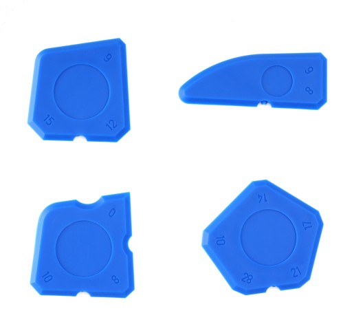 Zestaw 4 szpachelek z elastycznego tworzywa sztucznego, do nakładania świeżej masy uszczelniającej (silikonu, fugi). Umożliwiają uzyskanie czystej, równomiernie gładkiej powierzchni masy uszczelniającej. Nie uszkadzają krawędzi i nie rysują glazurowanych powierzchni.