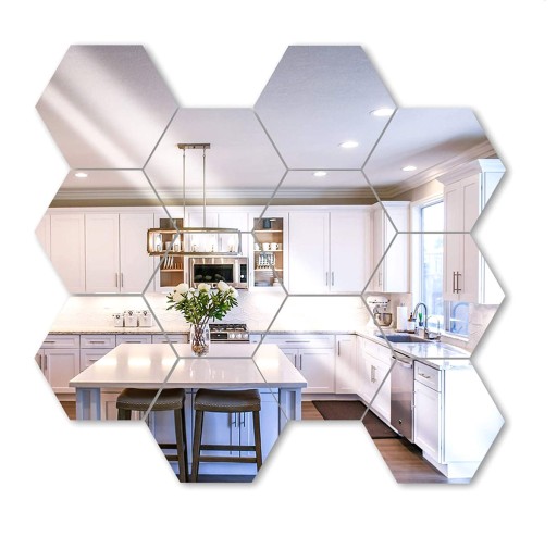 Zestaw dekoracyjnych paneli ściennych w kształcie sześciokąta - 12 akrylowych luster o wymiarach 17,5 cm x 15,5 cm.