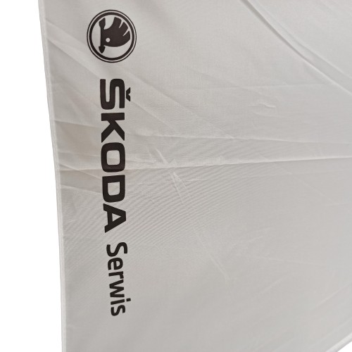 Elegancki biały parasol z napisem i logo Skoda Serwis