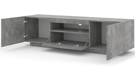 Uniwersalna szafka pod telewizor, idealna do salonu lub pokoju młodzieżowego. Szafka jest uniwersalna - można ją powiesić na ścianie lub postawić (posiada cokoły, które można opcjonalnie zamontować). Szafka jest wykonana w nowoczesnym stylu Posiada jedną otwartą półkę (miejsca przeznaczone na dekodery lub konsole) oraz trzy zamykane schowki (dwa otwierane na boki i jeden do dołu)