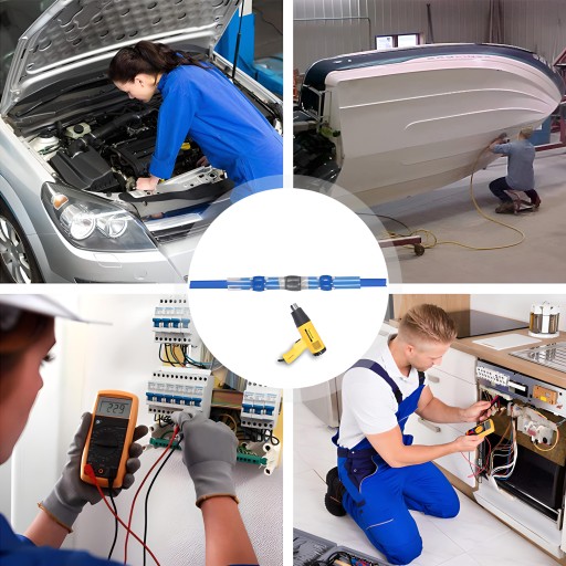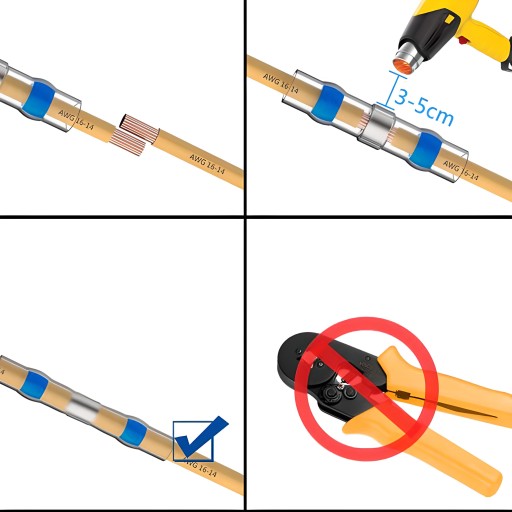 Zestaw szybkozłączek termokurczliwych z cyną i rurek termokurczliwych jest niezastąpiony w przypadku gdy chcemy mocno i pewnie połączyć lub naprawić przewody. W rurce termokurczliwej znajduje się ring z cyną która po podgrzaniu do ok 140°C topi się i łączy przewody. Dodatkowo wewnątrz szybkozłączki znajduje się warstwa kleju która wzmacnia i zabezpiecza połączenie przed wilgocią. Po złączeniu przewodów nie wymagana jest żadna dodatkowa izolacja.