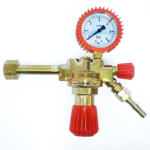 Typowy reduktor do propanu stosowany w spawalnictwie. Utrzymuje ciśnienie na żądanym poziomie bez względu na ilość gazu w butli. Wyposażony w gumową osłonę chroniącą manometr.