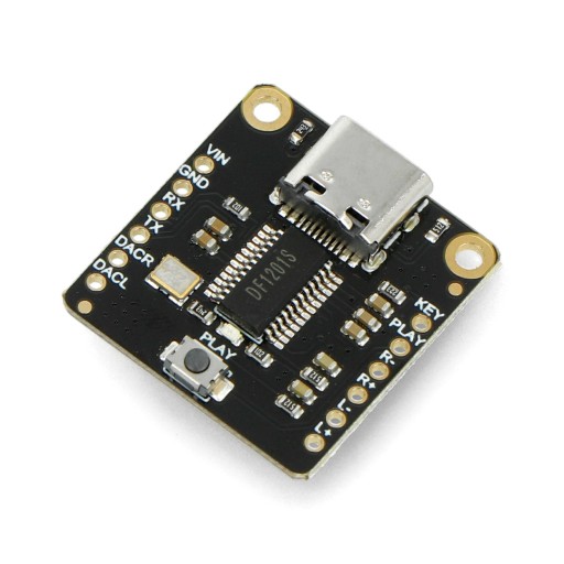 Dwukanałowy miniodtwarzacz MP3 wyprodukowany przez DFRobot. Może być obsługiwany na cztery sposoby: za pomocą Arduino (i płytek pochodnych), poprzez polecenia AT, kluczem ADKEY lub fizycznie za pomocą umieszczonych na płytce przycisków funkcyjnych. DFPlayer Pro posiada 128 MB pamięci wbudowanej, dlatego też można z niej korzystać bezpośrednio i bez konieczności stosowania karty FT. Ponadto moduł został wyposażony w złącze USB typu C, za pomocą którego można w łatwy sposób przesyłać pliki audio. Niewątpliwą zaletą jest także funkcja pozwalająca na przewijanie utworu do przodu i do tyłu.