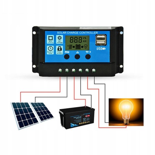 Solarny regulator i kontroler ładowania do paneli fotowoltaicznych 12/24V z wyświetlaczem LCD i portami USB.