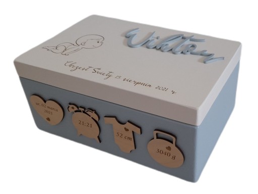 Po zakupie prosimy o podanie jakie ma być umieszczone na szkatułce, tj.: imię, data chrztu, data i godzina urodzenia dziecka, jego wzrost i wagę.