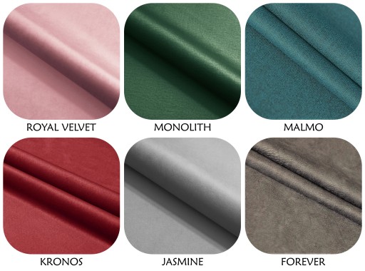 Tkanina Royal Velvet to materiał tapicerski o przyjemnej, welurowej powierzchni. Posiada ona bardzo dobre właściwości i wysokie parametry ścieralności, które świadczą o jej wytrzymałości. Royal Velvet zalicza się do tkanin typu plusz, posiadając gęste i miłe w dotyku włosie. Same mikrowłoski zmieniają również subtelnie swoje położenie, gdy przejedzie się po nich dłonią, co dodaje materiałowi pewnego uroku jeżeli chodzi o sam wygląd. Z pewnością jest bardzo przyjemny i komfortowy w kontakcie, stąd z powodzeniem można z niego korzystać z myślą o wyposażeniu użytkowym. Pomimo delikatności w dotyku, tkanina jest odporna na uciążliwe mechacenie się i trudno ją uszkodzić, o czym świadczy także wynik 100 000 w teście ścieralności Martindale'a - bez problemu nadaje się zatem do codziennego użytku domowego.