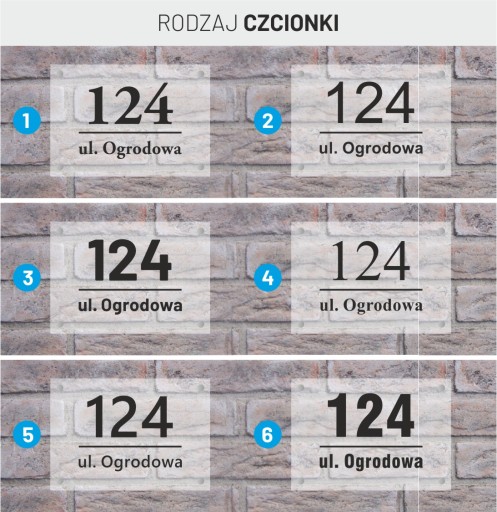 1. Adresu, który ma być na tabliczce (numer i ulica).