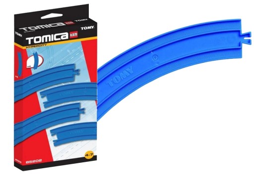 Zakręty torów z serii Tomica do rozbudowy kolei w mieście. W skład kompletu wchodzą 4 szt. zakrętów w kolorze niebieskim.