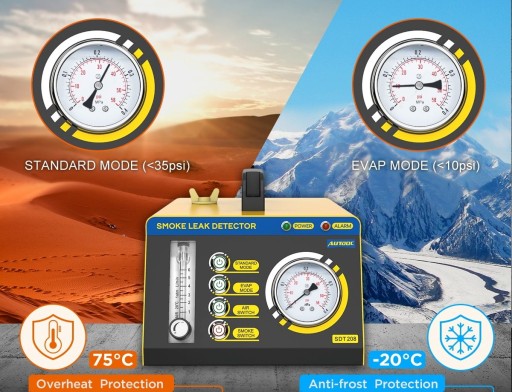 1.Niezbędne narzędzie dla techników samochodowych. AUTOOL SDT 208 ma własną pompę powietrza bez polegania na innych maszynach. Obserwując manometr, sytuacja wycieku jest widoczna na pierwszy rzut oka.