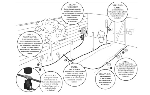 Nie musisz być elektrykiem ani mieć certyfikatów, aby zainstalować system in-lite. Działa przy napięciu 12 woltów (niskie napięcie). Oznacza to, że 230 woltów moc z gniazdka jest zamieniana na 12 woltów przez transformator. To jest bezpieczne napięcie, dzięki czemu oświetlenie zewnętrzne jest łatwe do podłączenia i w prowadzania dowolnych modyfikacji.