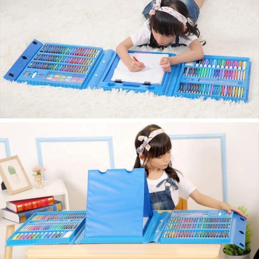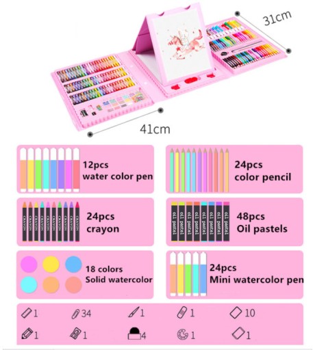 Zestaw zawiera: 24 x Kredki 12 x Pisaki grube 24 x Pisaków cienkich 48 x Pastele olejne 24 x Pastele 18 x Farb Akwarelowych 1 x Strugaczka 1 x Gumka 4 x Klipsy 1 x Czarna kredka 1 x Paleta na farby 1 x Linijka 1 x Klej 15 x Kartki A4 1 x Organizer / Podkładka 30 x Agrafki 1 x Gąbka 1 x Pędzel