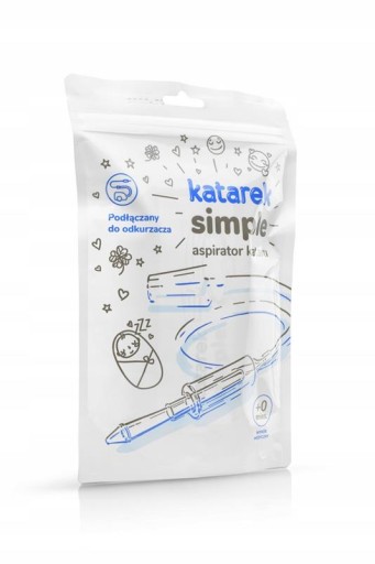 Katarek Simple to najprostszy, podstawowy model aspiratora podłączanego do odkurzacza. W opakowaniu znajdziemy aspirator Katarek Standard. Ma on jednolitą, nierozkręcaną komorę ze zbiorniczkiem na wydzielinę i reduktorem siły ssącej odkurzacza. Do urządzenia dołączono dwie wymienne końcówki przykładane do noska dziecka.