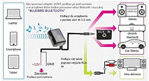 Odbiornik Bluetooth 12V umożliwiający słuchanie bezprzewodowo muzyki na urządzeniach bez funkcji Bluetooth - posiadających gniazdo Aux.