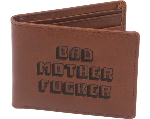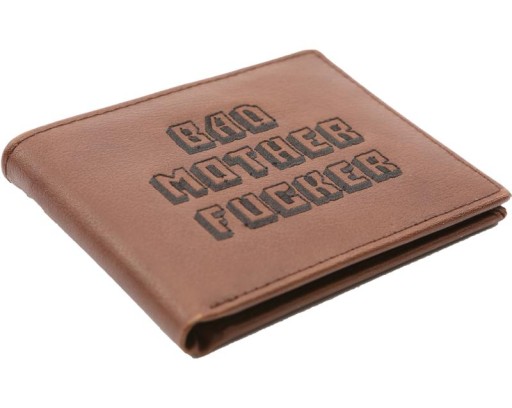 Wykonany z prawdziwej ciemnej skóry o wyraźnej fakturze, z czarnym wyszywanym napisem "Bad Mother Fucker". W środku znajdziemy kieszenie na karty, przezroczystą kieszonkę na dokumenty oraz podwójną szeroką kieszeń na banknoty.