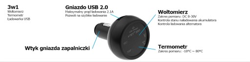 Ładowarka samochodowa 2,1A woltomierz, amperomierz, termometr 3 w 1.