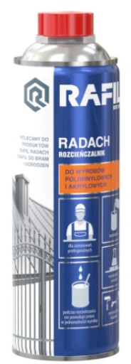 Produkt przeznaczony do rozcieńczania wyrobów na podłoża metalowe: Rafil Radach Farba Na Dach, Rafil Podkład Antykorozyjny, Rafil Do Bram I Ogrodzeń. Zalecany także do czyszczenia narzędzi po zakończeniu prac malarskich.