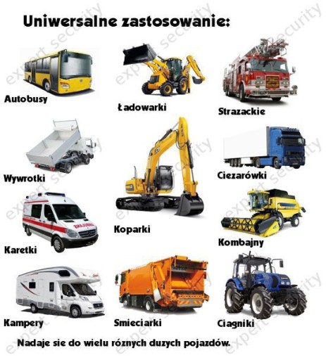 maszyn rolniczych, kombajnów, koparek, spychaczy, pługów śnieżnych, śmieciarek, autokarów, busów, tirów i dużych pojazdów ciężarowych, kamperów, karetek itp.