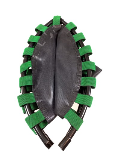 - następnie ( teraz będzie trudno bo gumy stworzą opór) przy pomocy drugiej osoby, nie na parkiecie (najlepiej na dywanie), rozkładamy trampolinę do pełnego kształtu - ostrożnie, ale zdecydowanie!