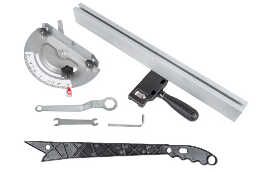 W zestawie znajdują się również: linijka kątowa, prowadnica równoległa oraz popychacz, które zwiększą zarówno precyzję cięcia jak i bezpieczeństwo pracy. Zestaw kluczy pomoże w szybkim montażu i demontażu poszczególnych części.