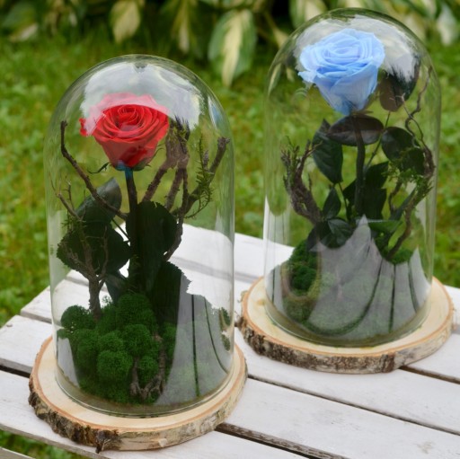 Prawdziwa wieczna róża w szklanej kopule wraz mchem Chrobotkiem i stabilizowanymi dodatkami (eukaliptus, hortensja, lagurus, gipsówka). Taka kompozycja to około 2 lata naturalnego piękna. Nie wymaga pielęgnacji aby cieszyć swoim wyglądem. Kompozycje tworzymy samodzielnie z wysokiej jakości kwiatów. Zarówno główka róży, łodyga jak i liście róży są prawdziwe i poddane procesowi utrwalenia.