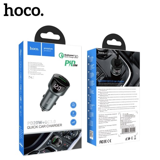 hoco Z42 Light road to ładowarka samochodowa z dwoma gniazdami USB, jednym gniazdem w standardzie QC3.0 / Quick Charge 3.0 typu USB-A o mocy 18W a drugim USB Type-C Power Delivery PD o mocy 20W, wspierająca takie standardy szybkiego ładowania jak PD2.0 / 3.0, iPhone PD20W, QC3.0 / QC2.0 / Huawei FCP czy Samsung AFC. Ładowarka posiada dodatkowo wyświetlacz LED wskazujący stan akumulatora na starcie, po rozruchu silnika oraz napięcia i prąd podczas ładowania urządzenia mobilnego.