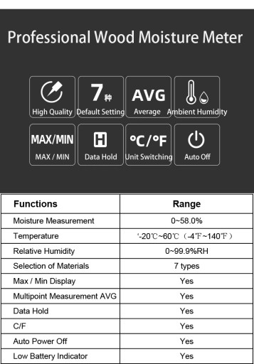 Miernik wilgotności HT632 posiada 7 ustawień, które pozwalają zapewnić precyzyjny pomiar wilgotności różnych materiałów m.in. drewna, cegły, betonu, gipsu, cementu, kartonu. Umożliwia także dokonywanie średniego pomiaru z wielu punktów.