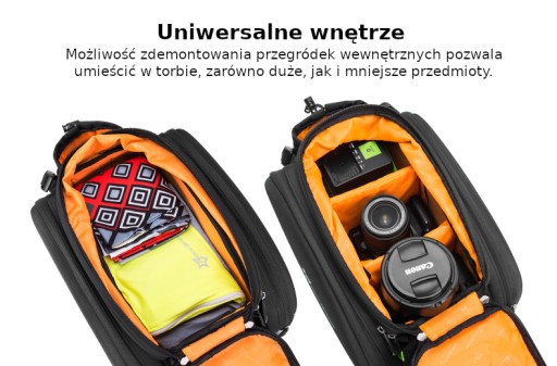 ELASTYCZNA KONSTRUKCJA: Przegrody w głównej komorze sakwy utrzymują aparat lub telefon oddzielnie od innych ostrych przedmiotów, takich jak klucze lub narzędzia rowerowe. Demontowalne wewnętrzne przegrody pozwalają podzielić wnętrze torby według potrzeb. Co więcej, główna komora jest wyściełana dookoła, aby Twoje rzeczy były dobrze chronione.