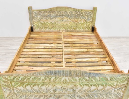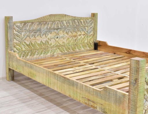 Kolonialne łóżko z oryginalnym hinduskim stelażem wykonane ręcznie w Indiach w 100% z litego drewna mango, przeznaczone pod wymiar materaca 180x200 cm. Łóżko kolonialne utrzymane w stylistyce Shabby Chic - przecierane, malowane, ręcznie rzeźbione.