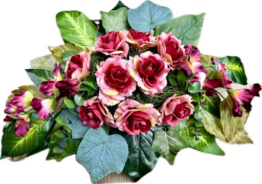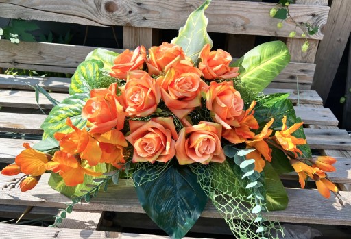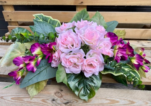 Piękna wiązanka, jak żywa kompozycja, ale pozostanie na grobie o wiele dłużej, niż kwiaty cięte. W ofercie kilka opcji kolorystycznych.