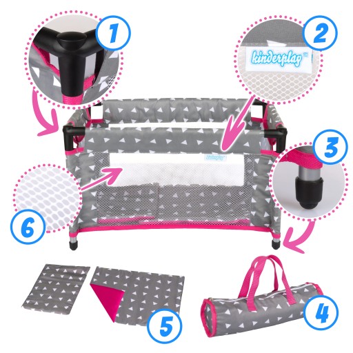 Łóżeczko dla lalek od firmy Kinderplay to prześliczna zabawka z pewnością spodoba się każdej dziewczynce. Utrzymany w tradycyjnej stylistyce i atrakcyjnych kolorach. Dzięki dużym panelom z siatki po bokach Twoje dziecko zawsze może uważnie obserwować swoją lalkę. Łóżeczko podróżne można łatwo zdemontować i przechowywać w przenośnej torbie. Sprzedawane łóżeczko nie zawiera lalek.