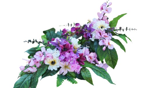 W skład wiązanki i bukietu wchodzi zestaw sztucznych kwiatków w odcieniach pudrowego różu, fioletu i kremu: