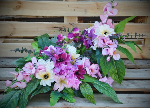 Komplet: wiązanka i bukiet są piękne, jak żywe kompozycje, ale pozostaną na grobie o wiele dłużej, niż kwiaty cięte.